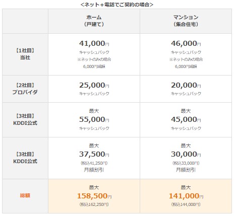 auひかりにはキャッシュバックがあります(3社分)。