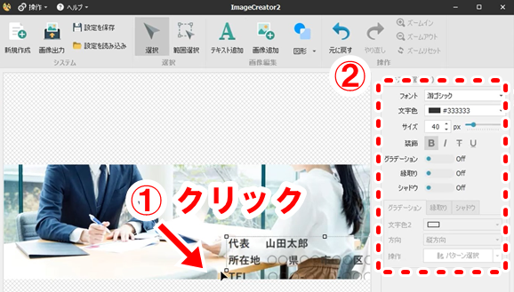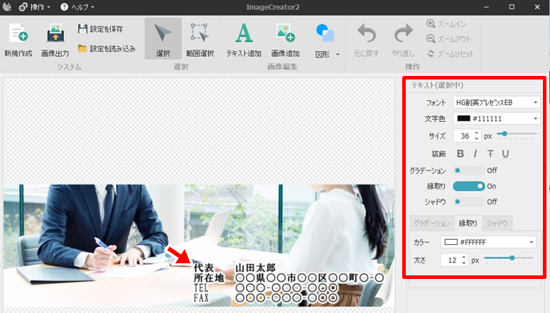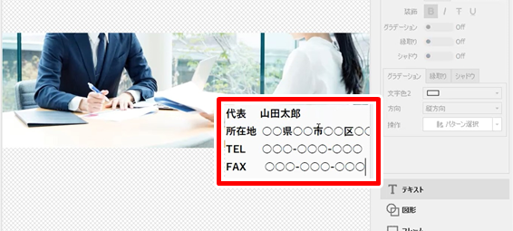 では、ヘッダー画像の右下に事務所の代表者名、所在地、電話番号、ファックス番号等の基本情報を入力していきましょう。