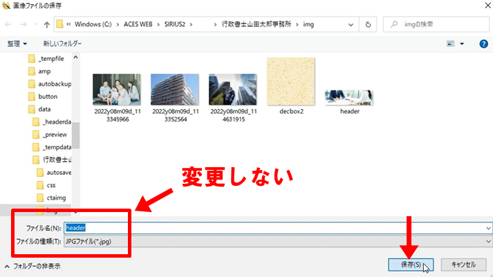 ファイル名は「header」、ファイルの種類は「JPGファイル」でなければいけません。