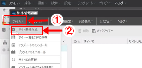 まず、左上の「ファイル」をクリック→「サイト新規作成」をクリック