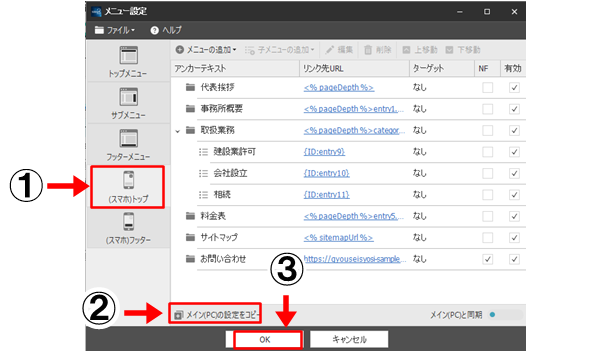 続いて、左サイドの「(スマホ)トップ」をクリックし、左下の「メイン(PC)の設定をコピー」をクリックして「OK」をクリックします。