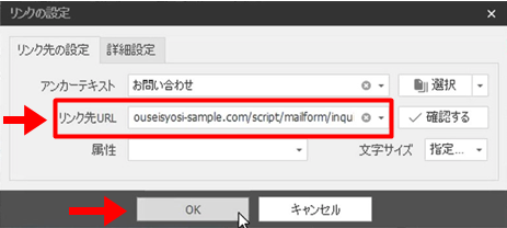 そして、「リンク先URL」の空欄にお問い合わせフォームのURLを入力します。