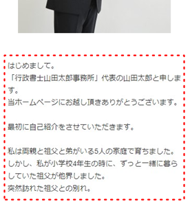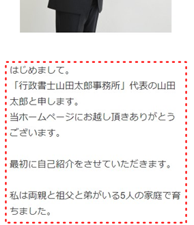 - 新人行政書士は「プロフィール」を熱く書きましょう。 新人には実績≠ェありません。 しかし、情熱≠ヘあるはずです。 「プロフィール」を通じて、行政書士事務所開業にかけるあなたの情熱を ユーザーの心にしっかり届くように、熱く語ってください。 開業したての行政書士のホームページに訪れる人なんて あなたに実際に会って、あなたに興味を持った人だけです。 その人達をがっかりさせてはいけません。 とにかく熱く′黷チてください。