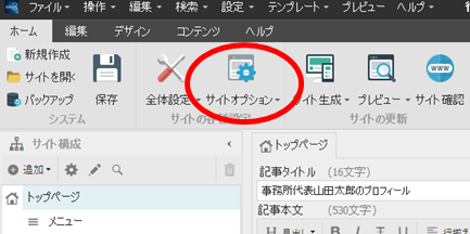 では、SIRIUS2を起動して記事編集画面を開いて、上部の「サイトオプション」をクリックします。