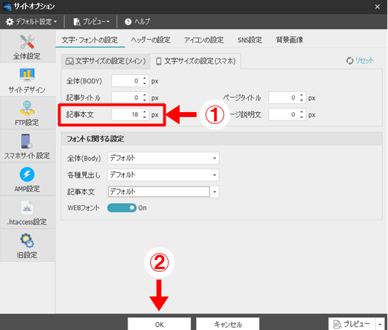これで、スマホサイトのフォントサイズの規定値が「18px」に変更されました。