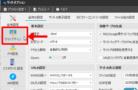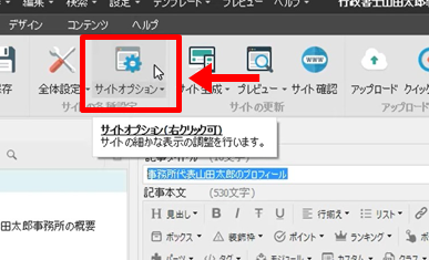 では、SIRIUS2を起動して、記事編集画面上部の「サイトオプション」をクリックしてください。