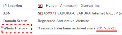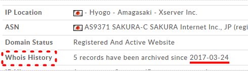 そして、「Whois History」を見るとドメイン取得日がわかります。