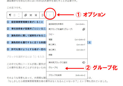数行にわたる場合は「オプション」をクリックして「グループ化」をクリック