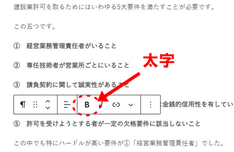 例えば、太字にしたい箇所があれば、その部分を選択して「B」をクリックすると太文字になります。