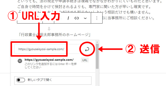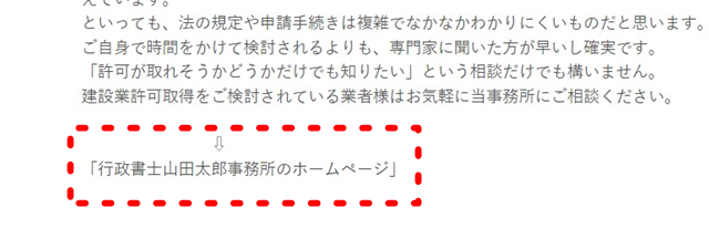 記事の最後に矢印をつけて「行政書士○○○○事務所のホームページ」と記入します。