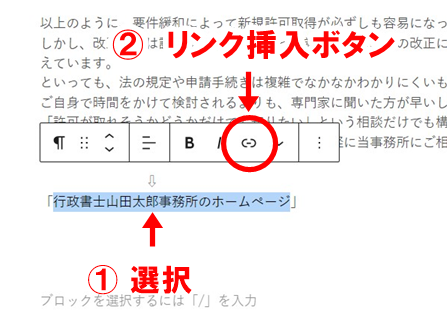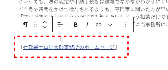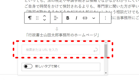そして、「行政書士○○○○事務所のホームページ」の部分を選択して、リンク挿入ボタンをクリックします。