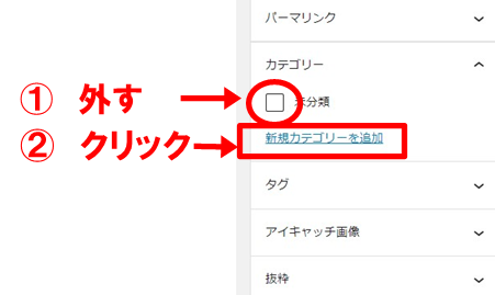 「未分類」のチェックを外して「新規カテゴリーを追加」をクリック
