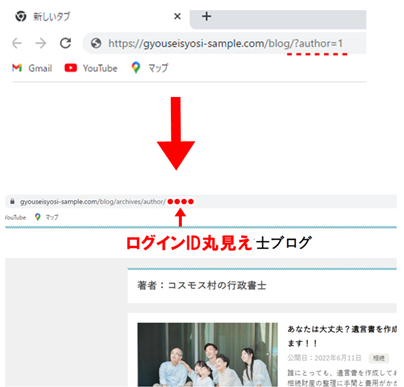 アドレスバーにログインIDが見えるようになるのです(もちろん、サンプルブログはその後に対策をしているので、今は見えません)。