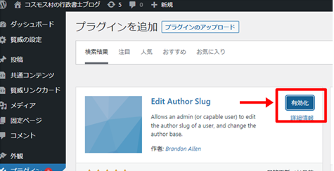 プラグイン「Edit Author Slug」が表示されるので「今すぐインストール」をクリック