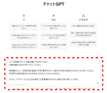 そして、「以下のブログ記事の要点を箇条書きにしてまとめてください。各箇条書きは140字以内で書いてください」と指令文を書いて、その下に自分が書いたブログ記事を入力します。